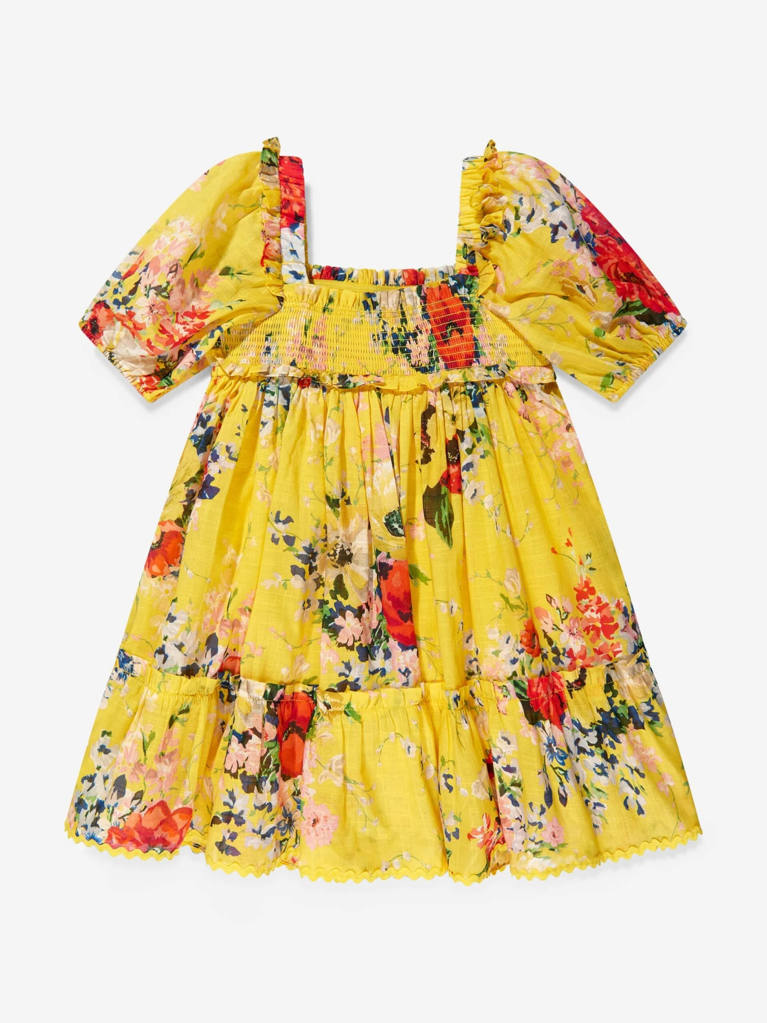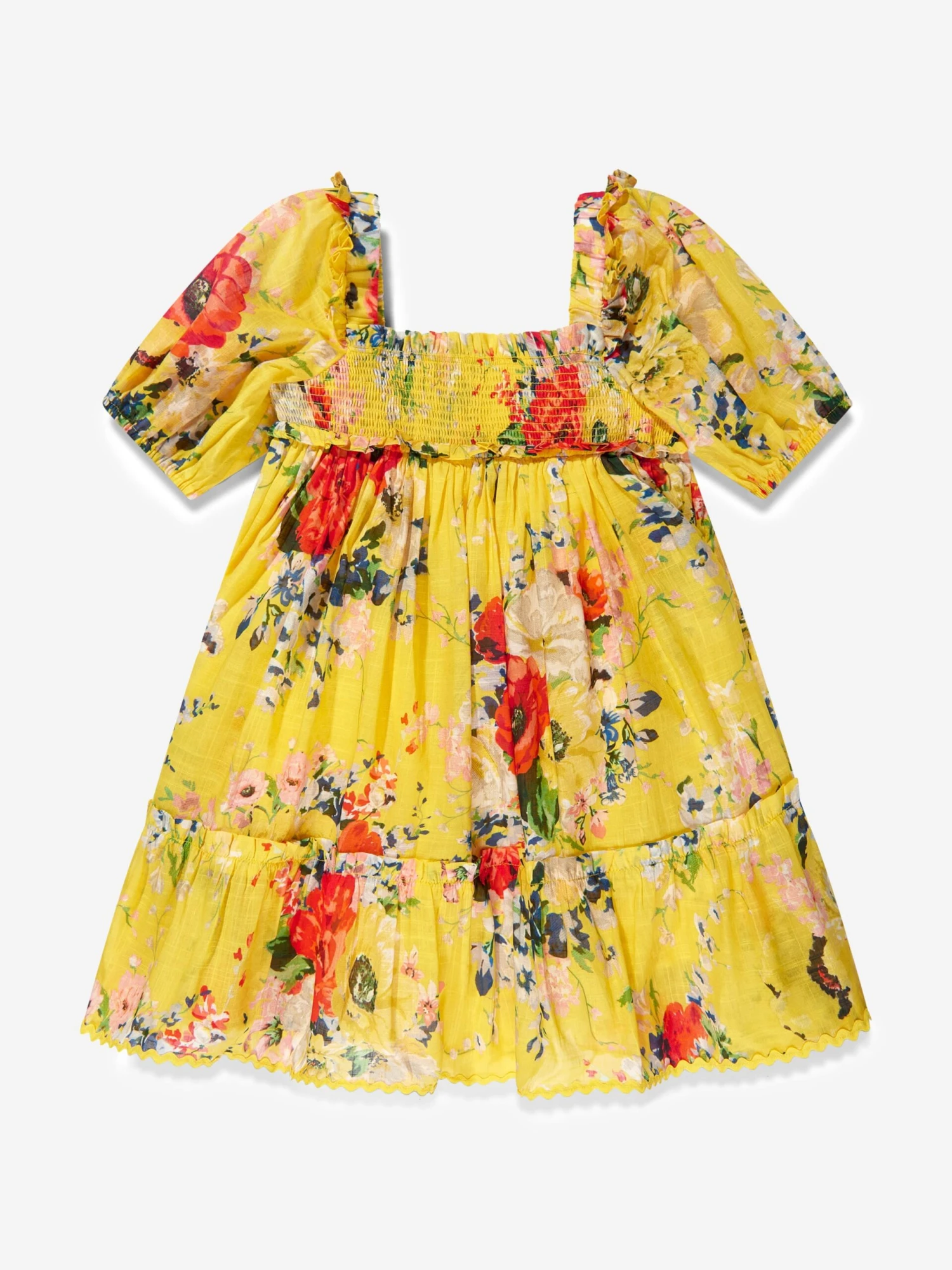 Australian label Zimmermann deconstruct the trend principle by exploring distinctive avenues of colour and craftsmanship. This yellow floral dress is depicted with beautifl red floral patterning. It features a ruched bodice with tiered trim edges and short puffy elasticated sleeves.