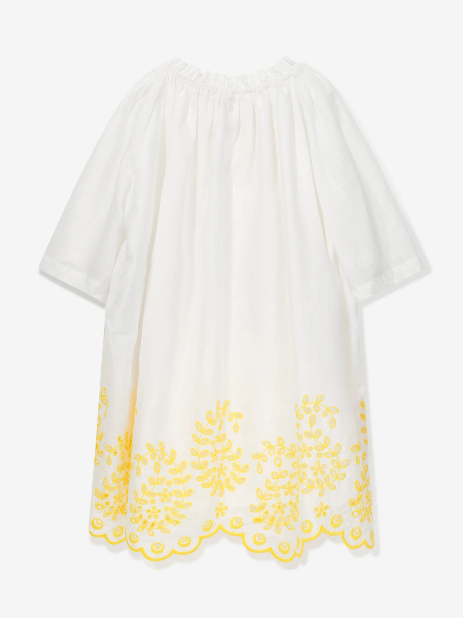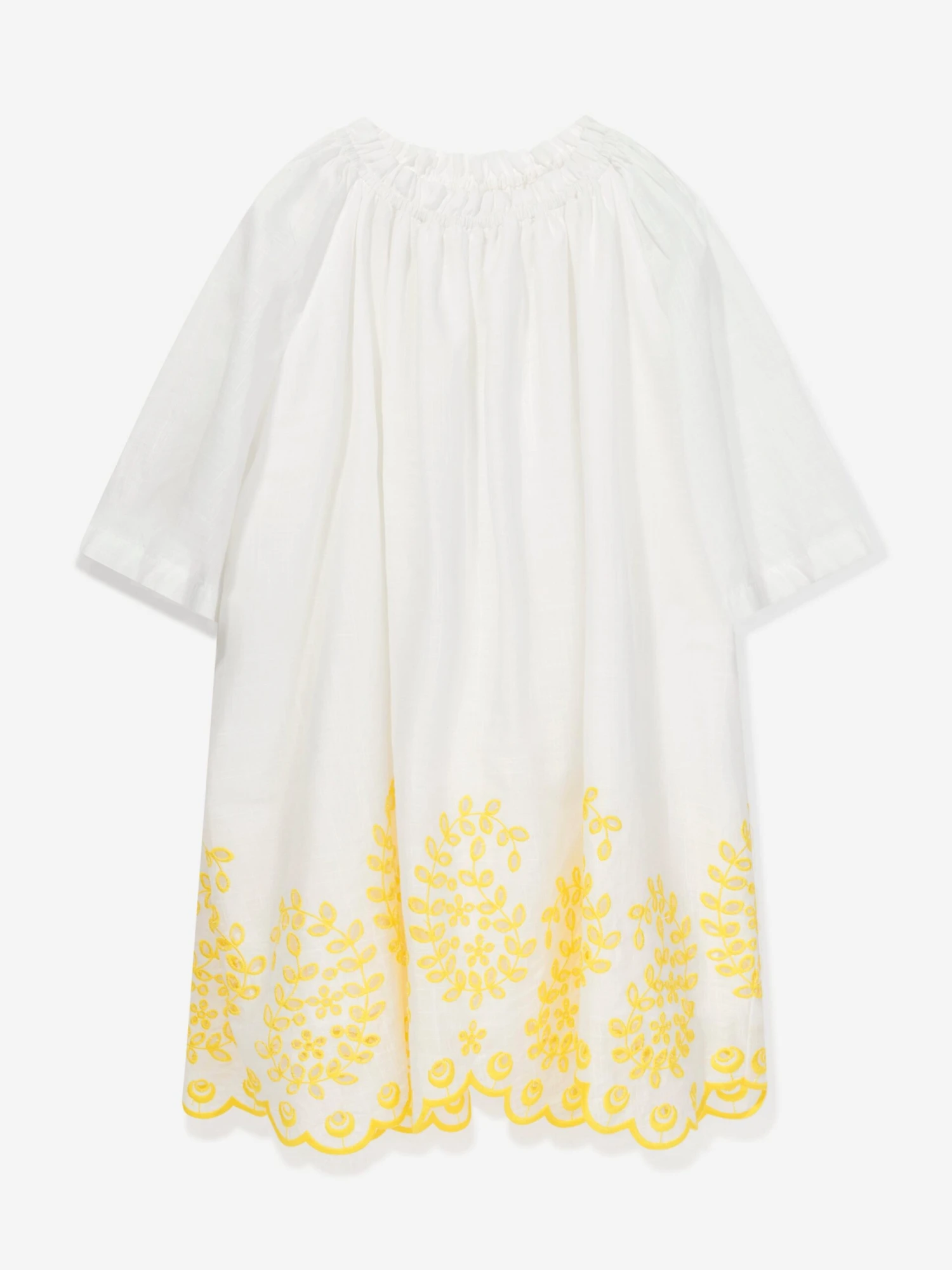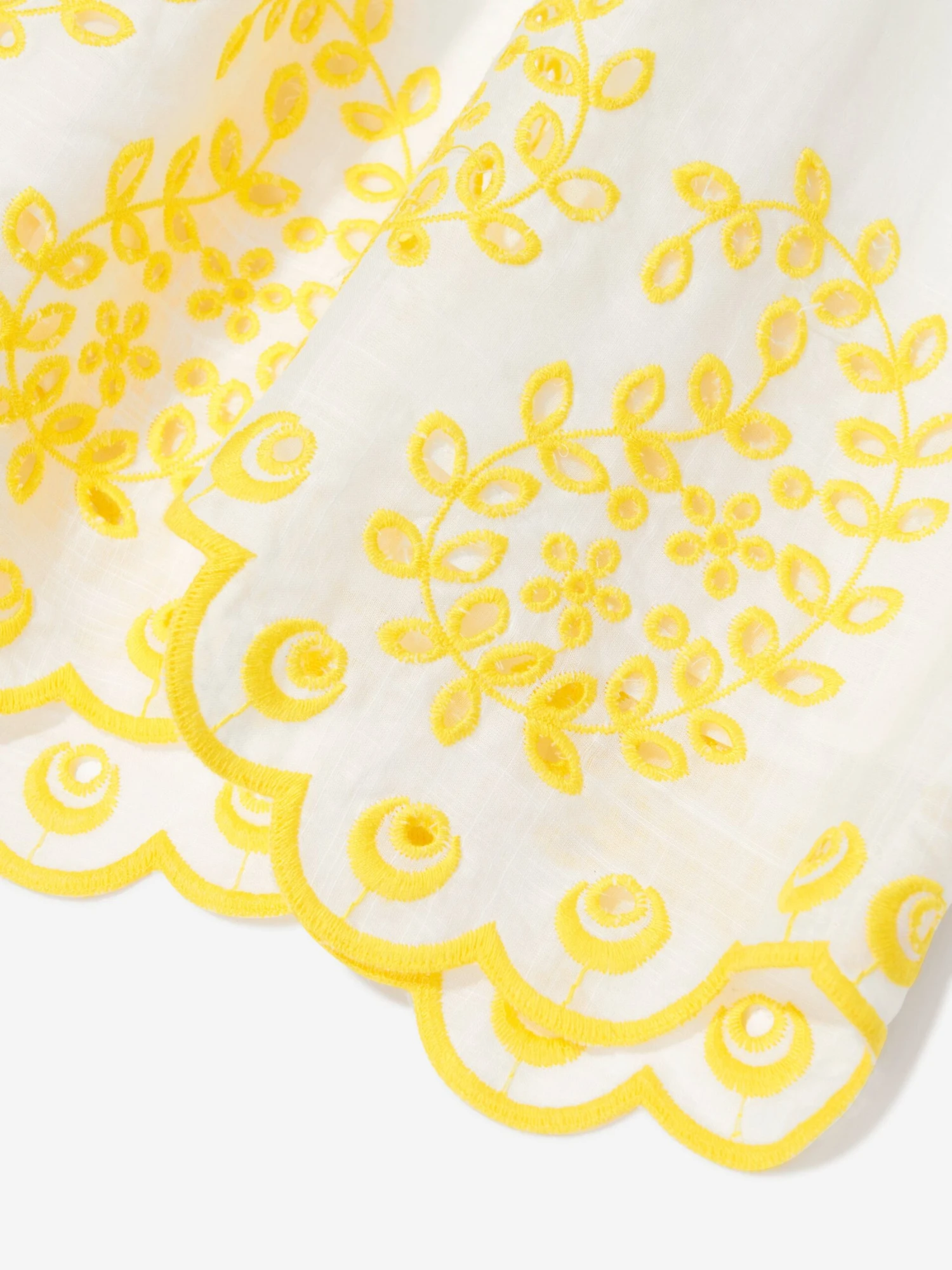Australian label Zimmermann create their own unparalleled preferences for colour and craftsmanship. This Junie embroidered dress captures the label’s dedication to high quality and distinctive concepts. Crafted in an ivory hued style with a yellow embroidered foliage pattern around the hem. It is complete with butterfly sleeves and a scalloped hem.